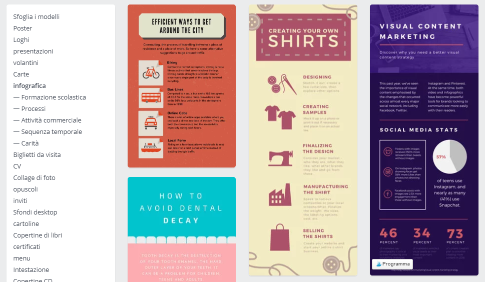 Nella parte a sinistra trovi un lungo menù. Per creare un media kit clicca sul termine Infografica. Ci sono, come vedrai tanti modelli, io ti suggerisco uno di quelli formato A4 che è anche facile stampare su un normale foglio bianco, come per esempio quello qui di seguito.